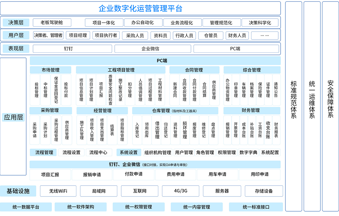 數(shù)字化管理系統(tǒng)對企業(yè)工程項目從項目投標中標、項目過程管理、合同管理、物資設備管理、采購管理、項目過程管理、施工隊管理、供應商、成本核算等進行全面綜合管理;縱向貫穿投標、采購、施工、竣工的全過程,橫向涉及公司內部的各相關崗位,是一套全方位、集成的企業(yè)項目綜合管理平臺。通過對成本、進度、質量、安全等方面的控制,以及對合同、結算、支付、資金等要素的管理,來提高工程類企業(yè)對工程項目的綜合配套能力。